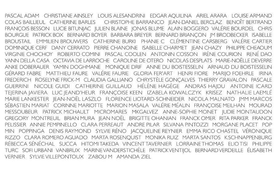 Mathieu Archambault de Beaune (Marseille), Guillaume Barborini (Metz), Benjamin Barreau (Lille), Chimène Berthe (Lille), Samuel Buckman (Nantes), Mario B.Schneider (Crest), Clémentine Carsberg (Marseille), Stéphane Cauchy (Lille), Baptiste César (Paris), Rodolphe Collange (Toulouse), Alexis Deconinck (Bruxelles), Anne Le Deist (Calais), Violaine Desportes (Roubaix), Marie-Noëlle Deverre (Alençon), Geoffroy Didier (Roubaix), Apolline Ducrocq (Dunkerque), Sébastien Eglème (Lyon), Grégory Grincourt (Calais), Eduardo Hargreaves (Brésil), Alex Herman (Lille), Mélina Hue (Pau), Matthieu Husser (Nantes), Joëlle Jakubiak (Dunkerque), Thibault Jehanne (Caen), Julien Kieffer (Lille), Paul Krulic (Roubaix), Donovan Le Coadou (Dunkerque), François Lewyllie (Lille), Antoine Liebaert (Montreuil), Christophe Loiseau (Lille), Gaëlle Lucas (Nantes), Coraline Magny (Lille), Béatrice Meunier-Déry (Roubaix), Clivia Nobili (Lille), Johan Parent (Grenoble), Lionel Pennings (Bruxelles), Virginie Piotrowski (Grenoble), Sandra Richard (Malakoff), Céleste Richard Zimmermann (Nantes), Detlef Runge (Bruxelles), Keen Souhlal (Paris), Chloé Schuiten (Bruxelles), Amélie Scotta (Bruxelles), Nicolas Tourte (Lille), Aurélien Veyrat (Lille).